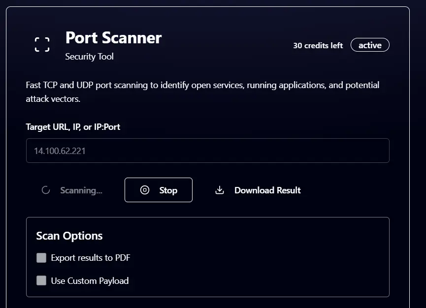 PortScanner helps detect open ports and running services across targets, enabling rapid threat identification and firewall audit.
